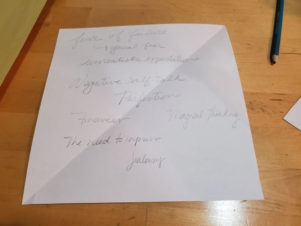 Starting with a square sheet of paper, use a pencil to write those expectations, thoughts or feelings that interrupt your joy.