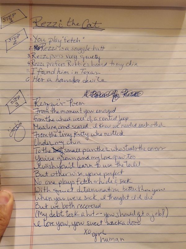 Write a list of specific things associated with your subject. The gift is one of your attention, it's less about judgment and more about observation. "My cat takes turns sitting in every window."