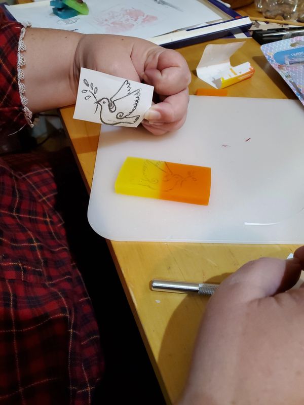 Step 1: Draw or trace a drawing with pencil on paper. Rub the stencil on a gum eraser.